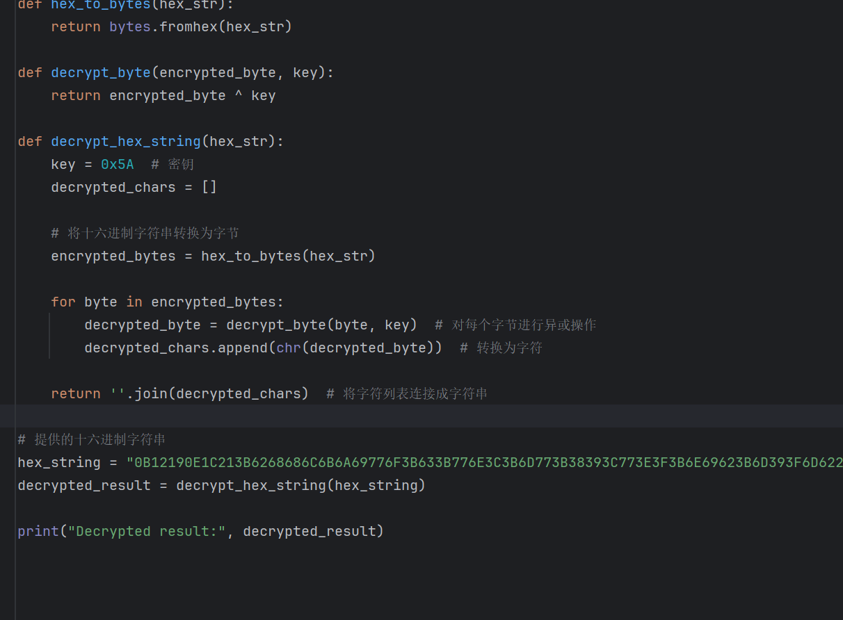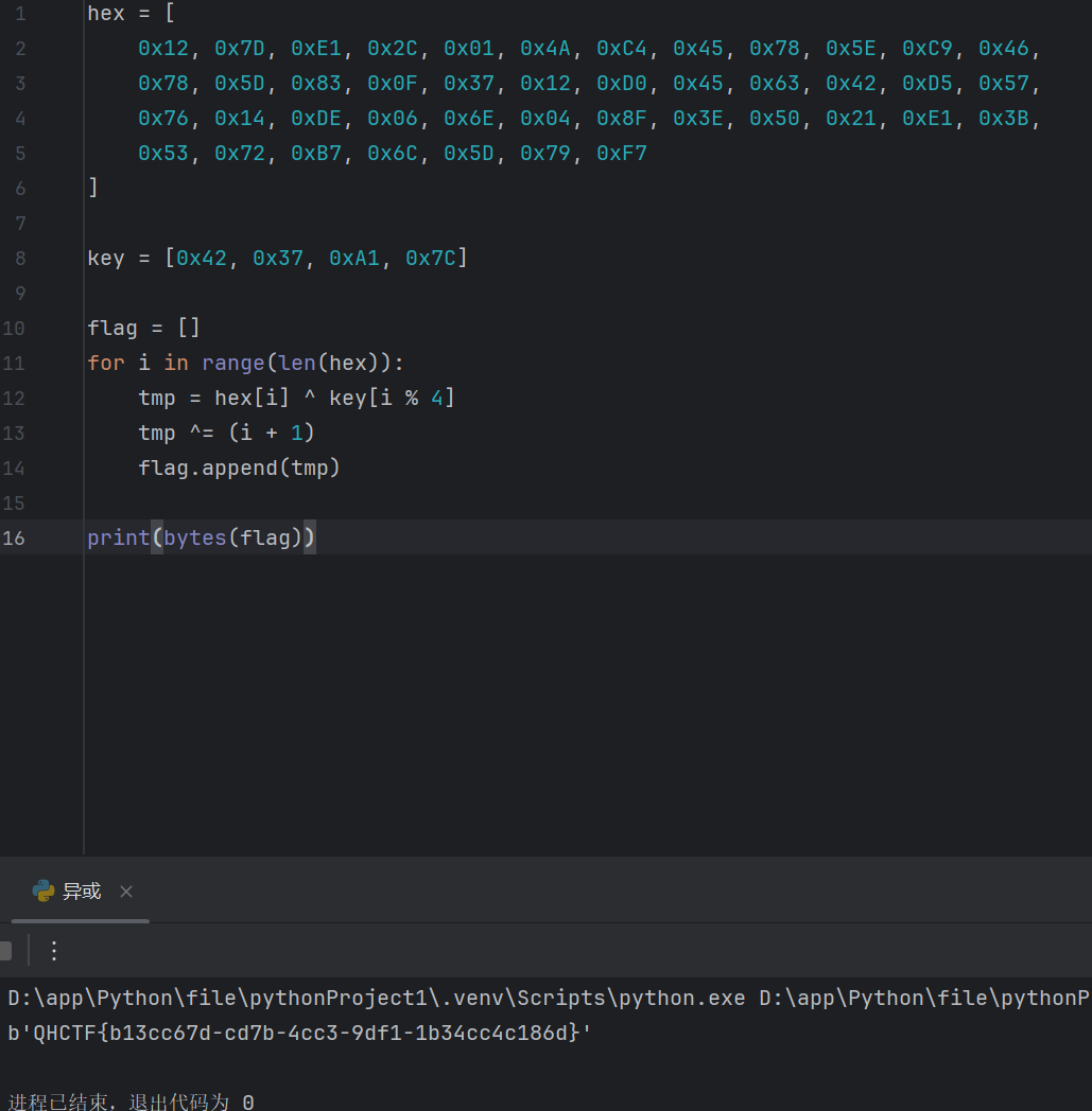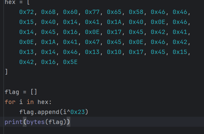 发现是十六进制字符串,写代码把它转换成字节再进行异或即可得到flag。
