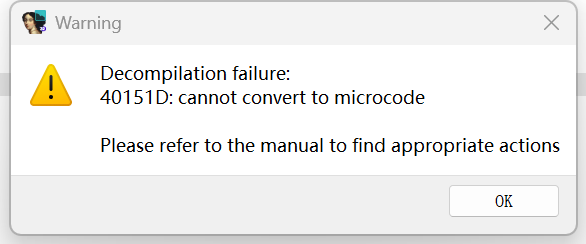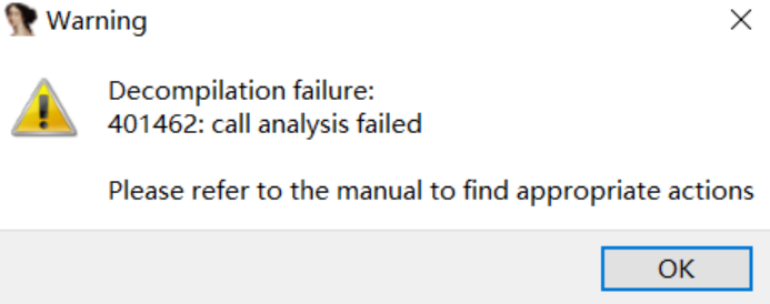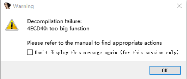 反编译函数大小最大值,使用KB单位计算。只有可读的基本块被统计在内。默认值是64,即64KB。出现这个报错,说明反编译函数的大小已经超过了64。