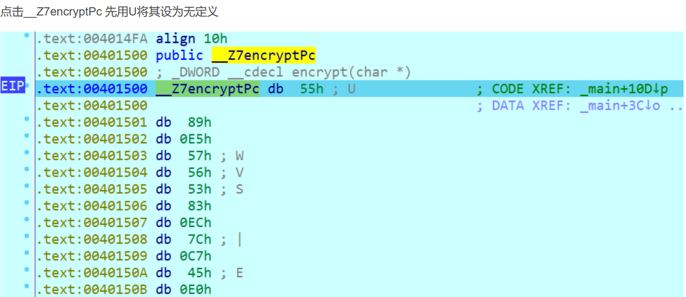 • 之后再点击_Z7进行P定义为函数,再用F5反编译。这里可以得到encrypt函数。