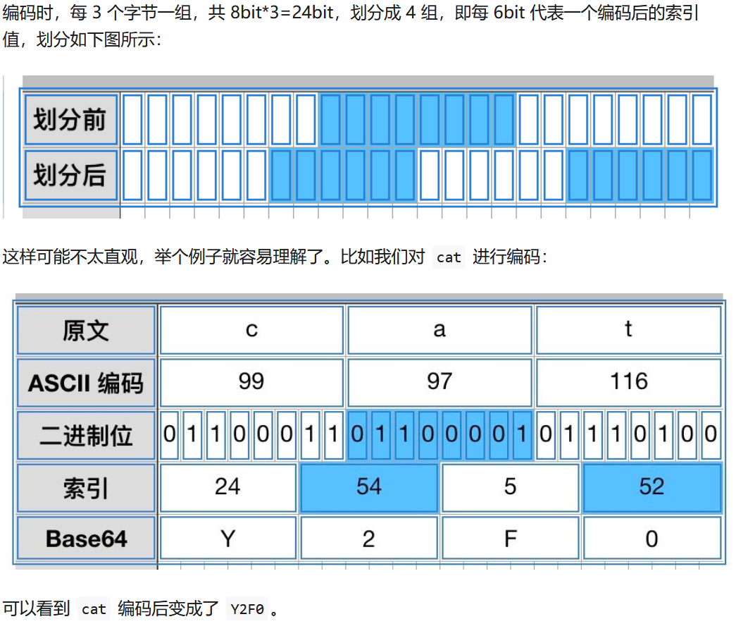 Base64 是一种基于 64 个可打印字符来表示二进制数据的表示方法。由于 2^6=64,所以每 6 个比特为一个单元,对应某个可打印字符。3 个字节有 24 个比特,对应于 4 个 Base64 单元,即 3 个字节可由 4 个可打印字符来表示。