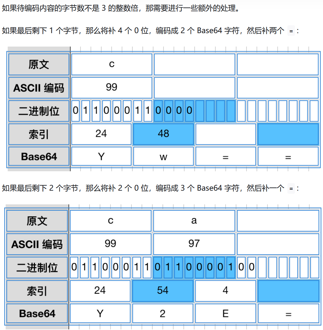 填充- 如果最后剩下 1 个字节,那么将补 4 个 0 位,编码成 2 个 Base64 字符,然后补两个